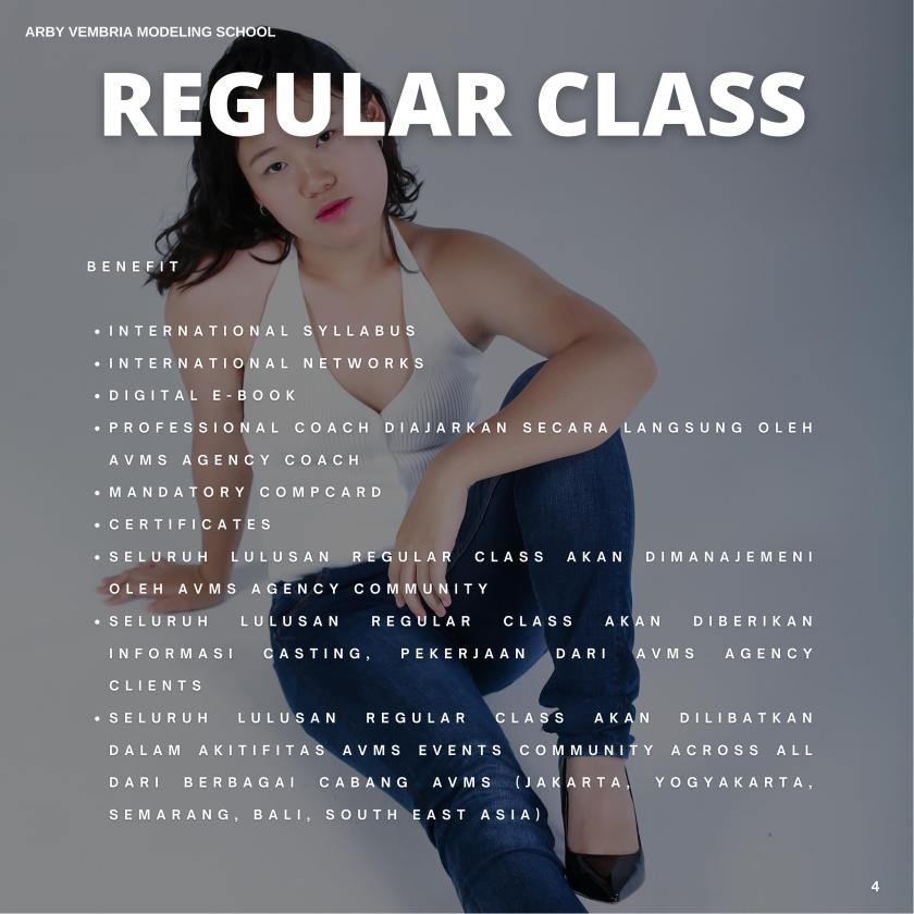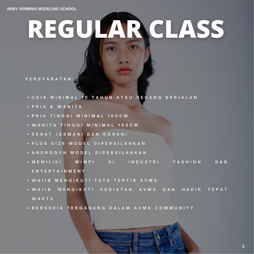 REGULAR TEEN CLASS adalah program yang dirancang AVMS untuk memberikan pengenalan dunia fashion modeling bagi para remaja. Fokus utama kelas ini adalah pembentukan postur dan gestur yang baik, terutama saat berjalan di catwalk.